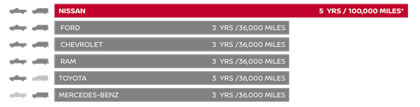 *Claim based on years/mileage (whichever occurs first) covered under the New Vehicle Limited Warranty basic coverage. Ward's in-market Large Pickup Segmentation and Small Pickup Segmentation v. 2019 TITAN and TITAN XD. Nissan's New Vehicle Limited Warranty basic coverage excludes tires, corrosion coverage and federal and California emission performance and defect coverage. Other terms and conditions apply. See dealer for complete warranty details.Â